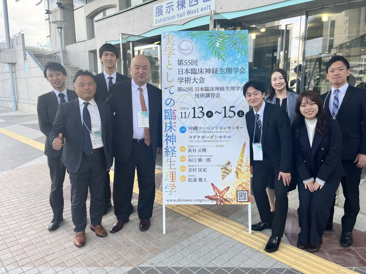 2025年11月13日から15日にかけて、第55回日本臨床神経生理学会学術大会が沖縄コンベンションセンターで開催されました。学術大会では、鈴木研究室で頑張っている関西医療大学 東藤真理奈講師がシンポジストとして登壇し、福本悠樹講師に加えて、大学院生の桂木さんと中山さん、準研究員の黒部さんと長谷さんが一般演題の発表を行いました。副学長の鈴木俊明教授は教育講演にて講演を行いました。詳しくは下記をご参照ください。医師を中心とした学術大会で、理学療法士がしっかりと発表を行い活躍する姿は、後進にとっても非常に刺激になったと思います。