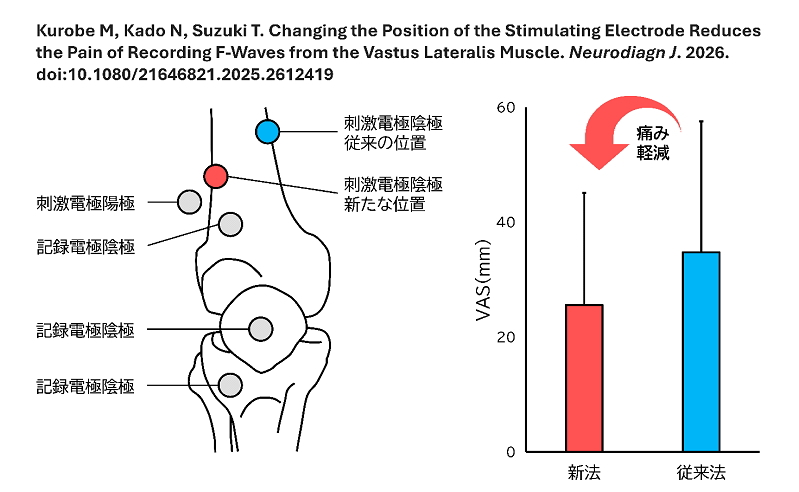 F波は、様々な疾患の診断や臨床研究に利用されている重要な検査指標です。しかし、外側広筋からF波を記録する際には、電気刺激によって強い痛みが生じるという課題がありました。それに対し本研究は、刺激電極の位置を調整することで、より痛みの少ないF波の記録方法を明らかにしました。